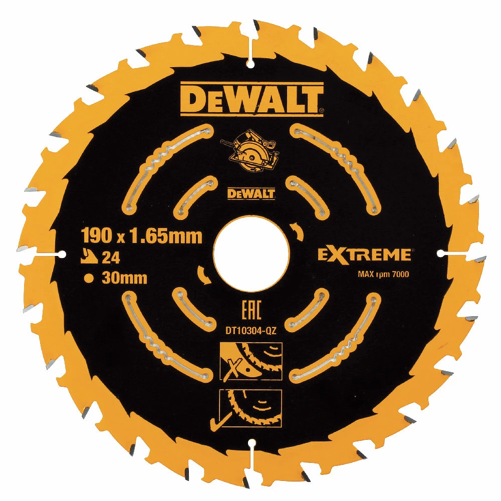 The DEWALT EXTREME 2nd Fix Circular Saw Blade 190mm 30mm Bore 24T has a thin kerf to ensure that less push force is required by the user and that they cut straighter with reduced binding. Anti-vibration slots and ultra sharp teeth deliver a superior cut finish.